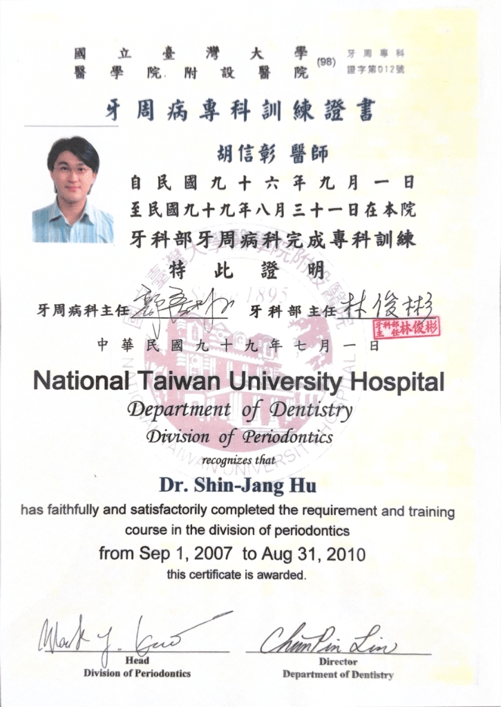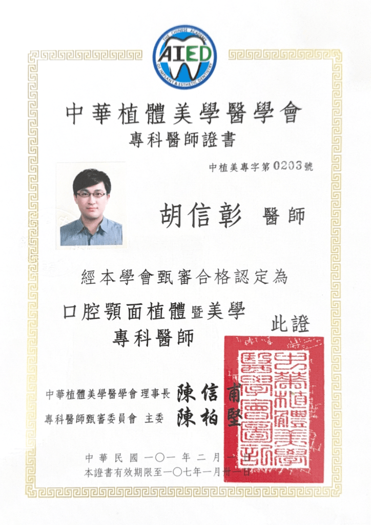 胡信彰牙醫師,目前服務於桃園京品牙科診所。