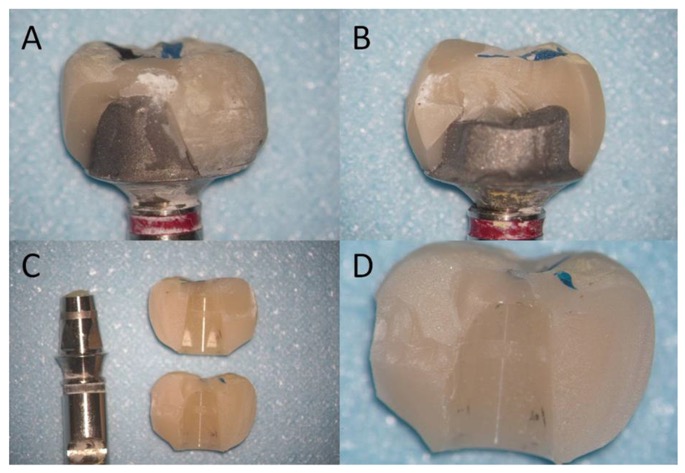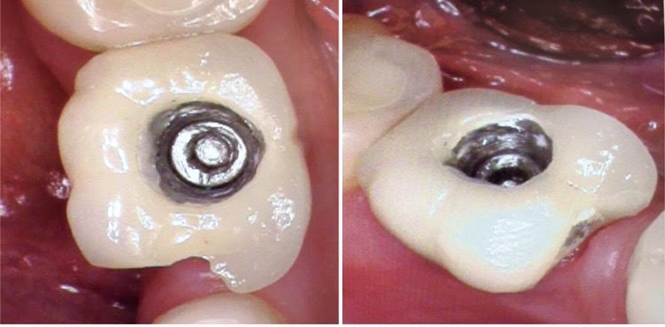 原因在於咬合空間不足且咬合位置異常時,施加於牙冠及植體的咬力相對會提高,此外,瓷牙所需要的厚度較全金屬牙冠多,因此有可能在瓷牙牙冠厚度不足的情況之下,或是咬合力過大的情況之下,造成瓷牙牙冠的瓷斷裂,如下圖所示: