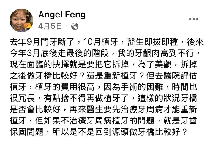 前一陣子,在臉書上看到有個女生抱怨著植牙治療,如下