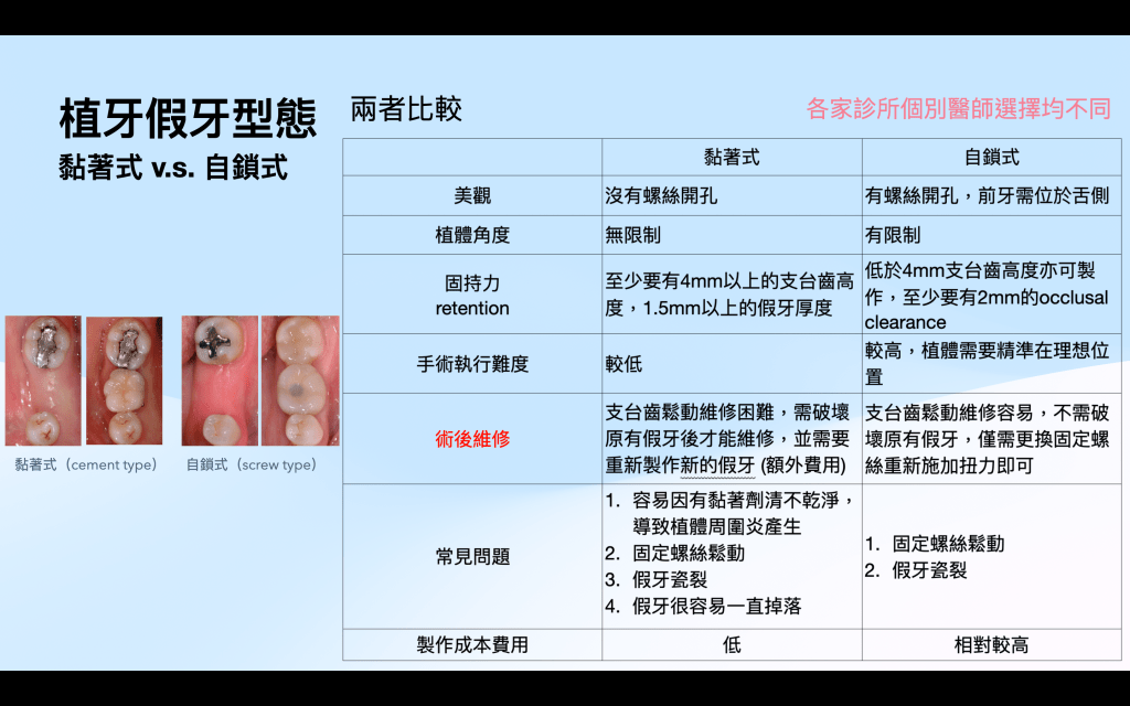 因此,對於後續維修則是以『自鎖式(screw type)』較為容易,並且減少了黏著劑污染而容易產生植體周圍炎(peri-implantitis),而其製作成本因工法較為繁瑣因此較高。