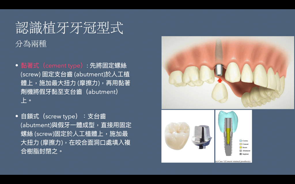 植牙假牙裝戴的形式區分為兩種:一種為黏著式(cement type),一種為自鎖式(screw type)。