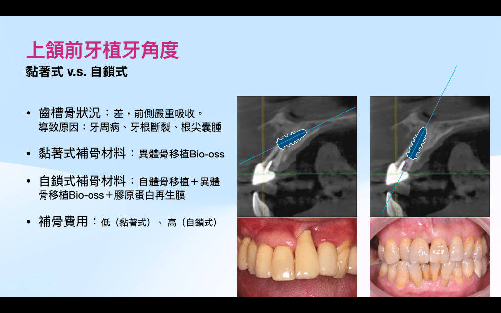 因為上頜齒槽骨構造的限制下,從下圖右側可見,倘若人工植體要植入齒槽骨的角度需符合自鎖式假牙的要求,從X光片可見植體在下緣根尖處顯然沒有足夠齒槽骨作為地基,因此需要進行自體骨移植與補骨及再生膜的使用,讓齒槽骨不足處增加厚度。