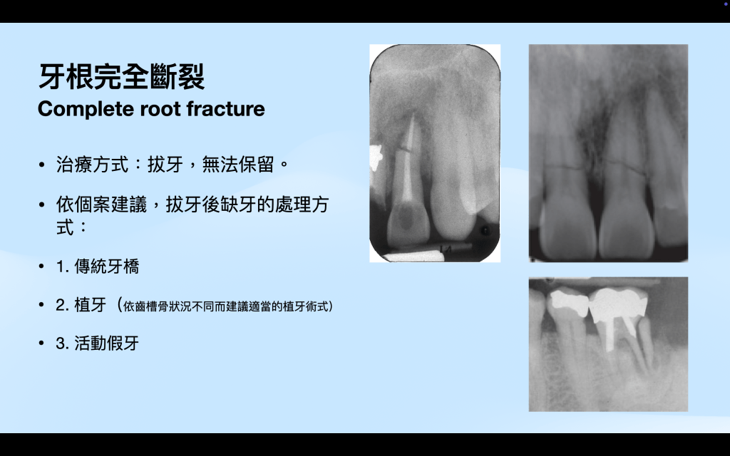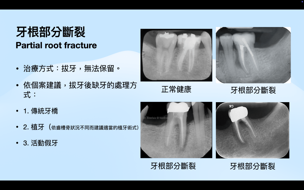早期不痛、後期不能救。(裂齒症的治療選擇:牙根斷裂只能拔牙。)
