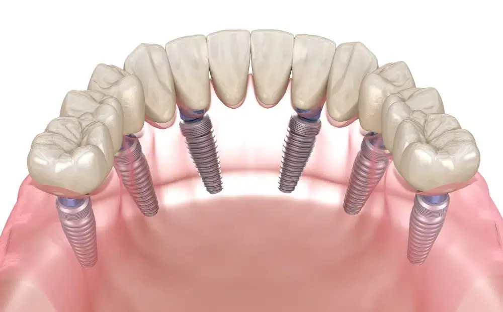 利用 4–10顆植體支撐整排假牙,用於全口或多顆嚴重缺牙患者。
