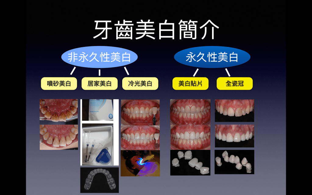 一種是藥劑式牙齒美白屬於非永久性美白方式,如:冷光美白、居家美白、美白筆,齒內美白