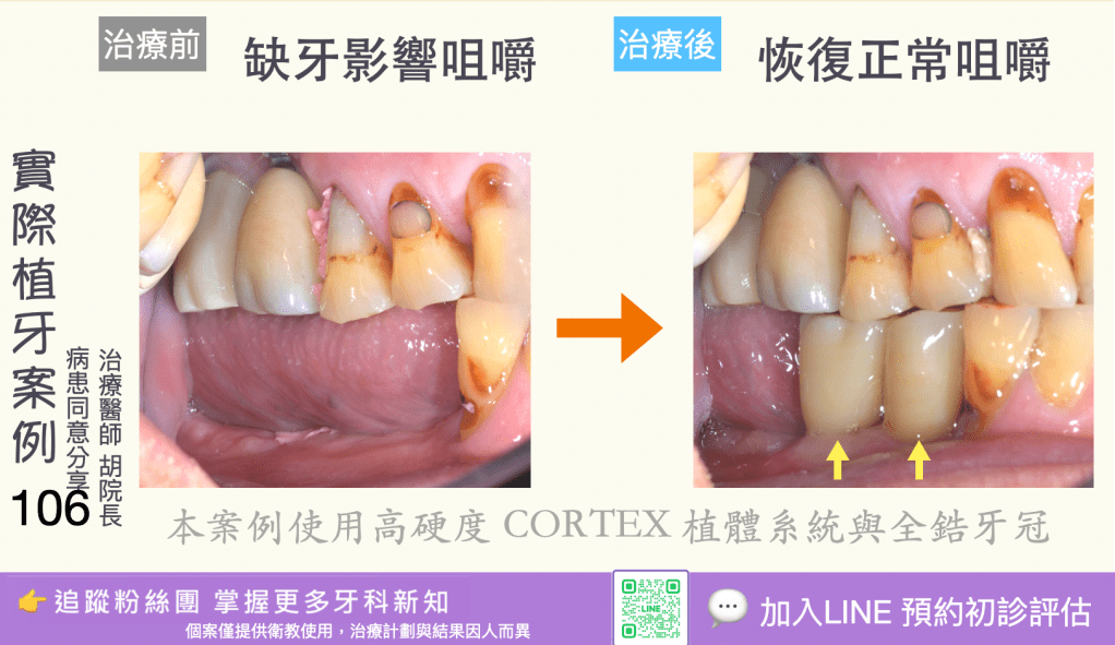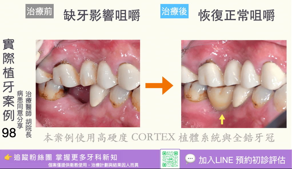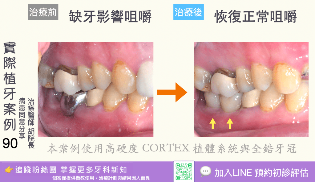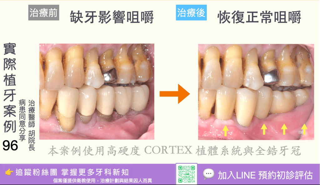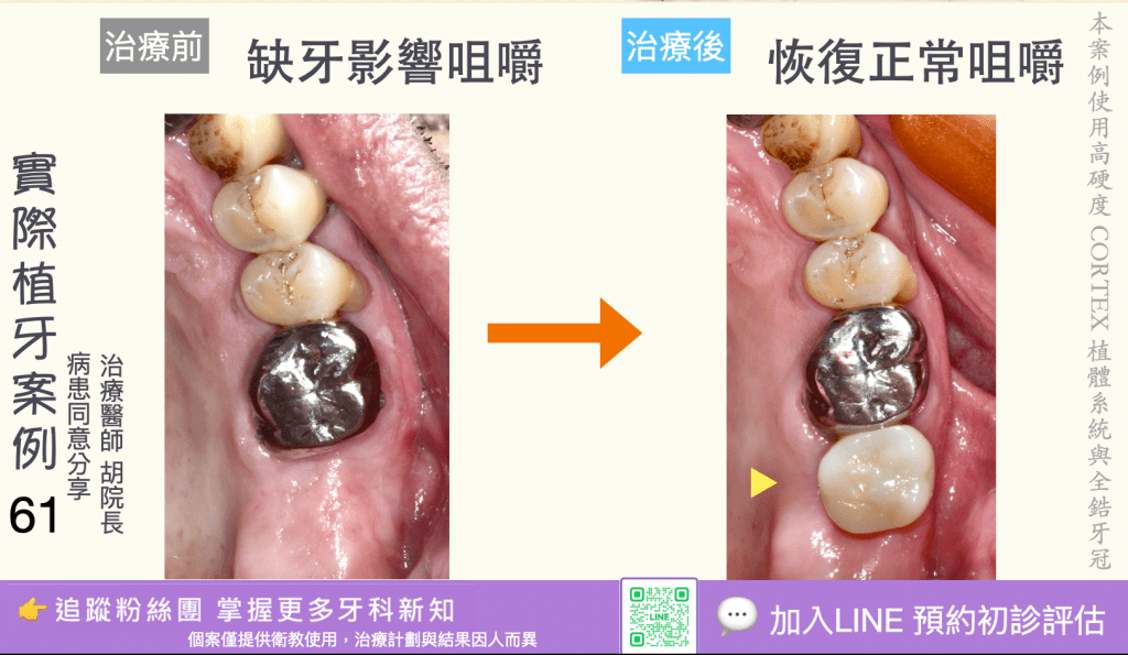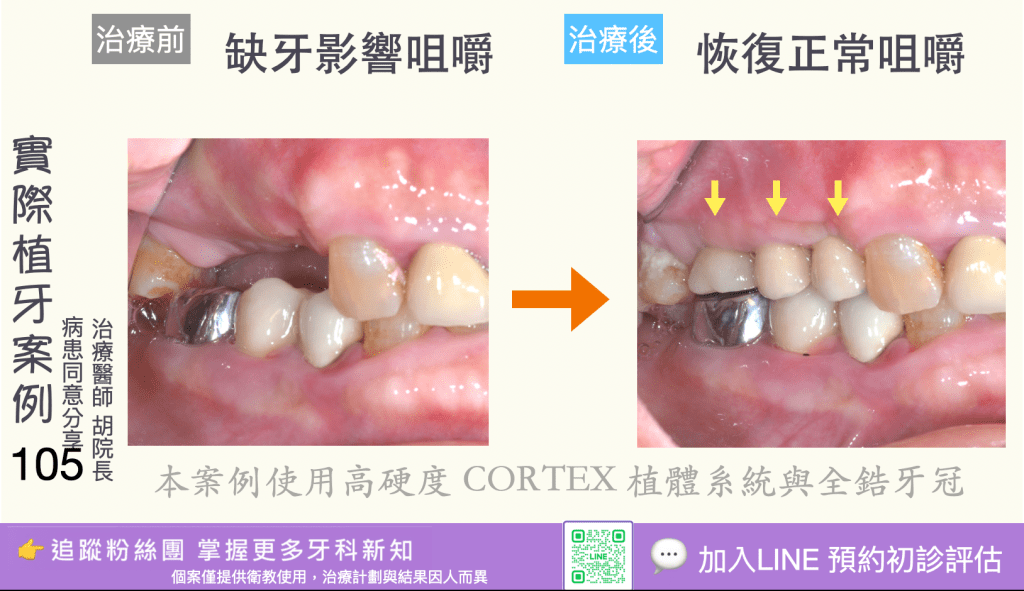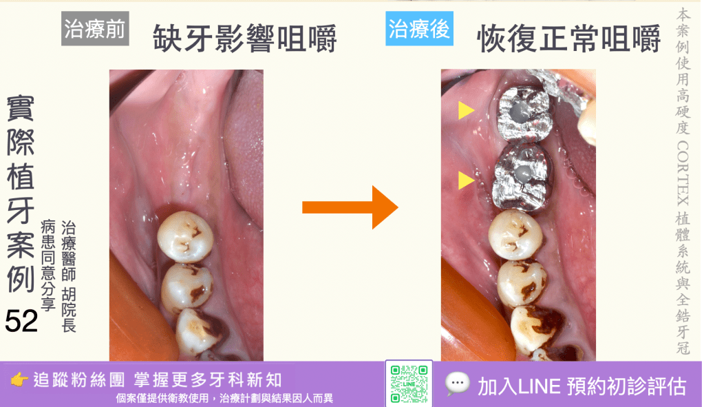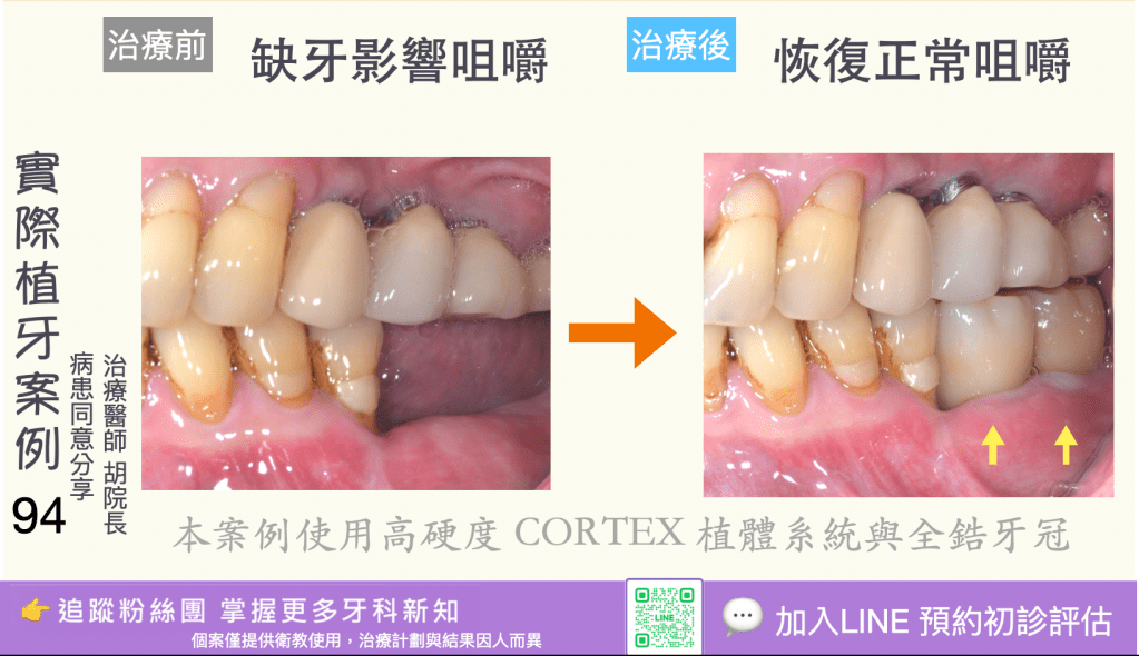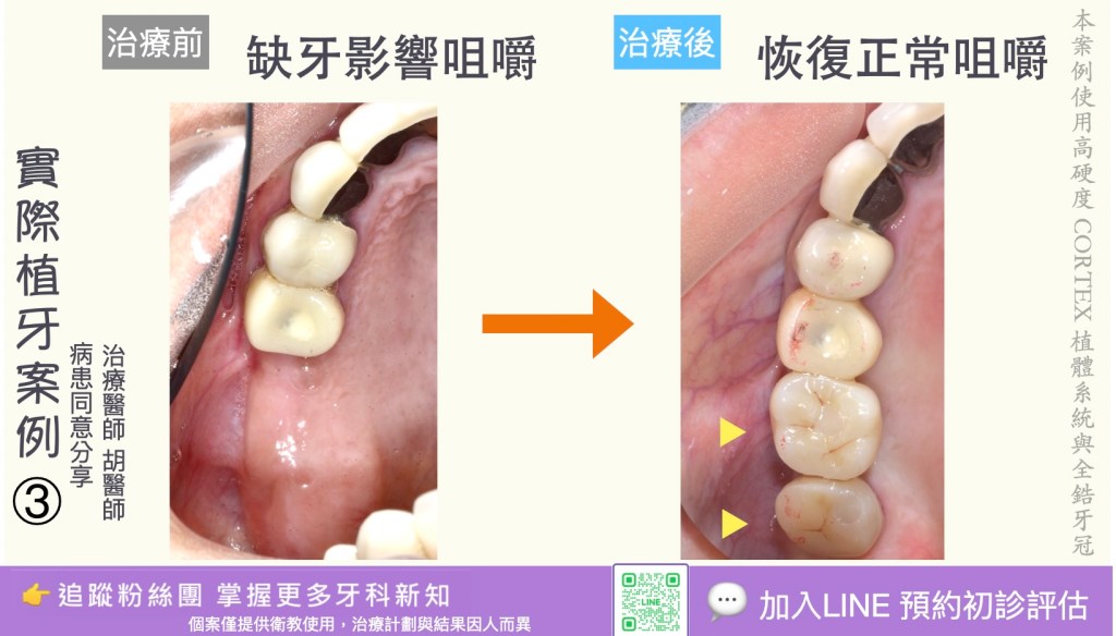 3. 時間較長:完整療程(評估→植體植入→癒合→修復)可能需數月(若需骨增量或分階段治療則更久)。