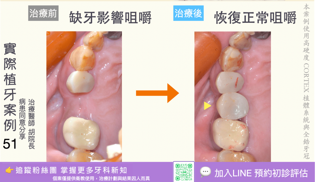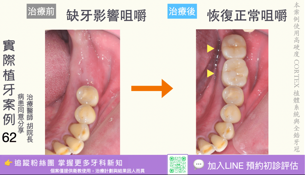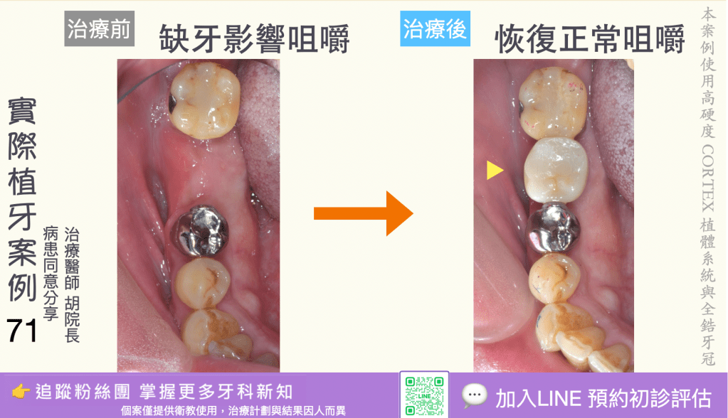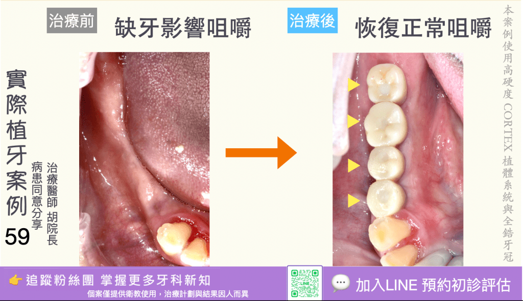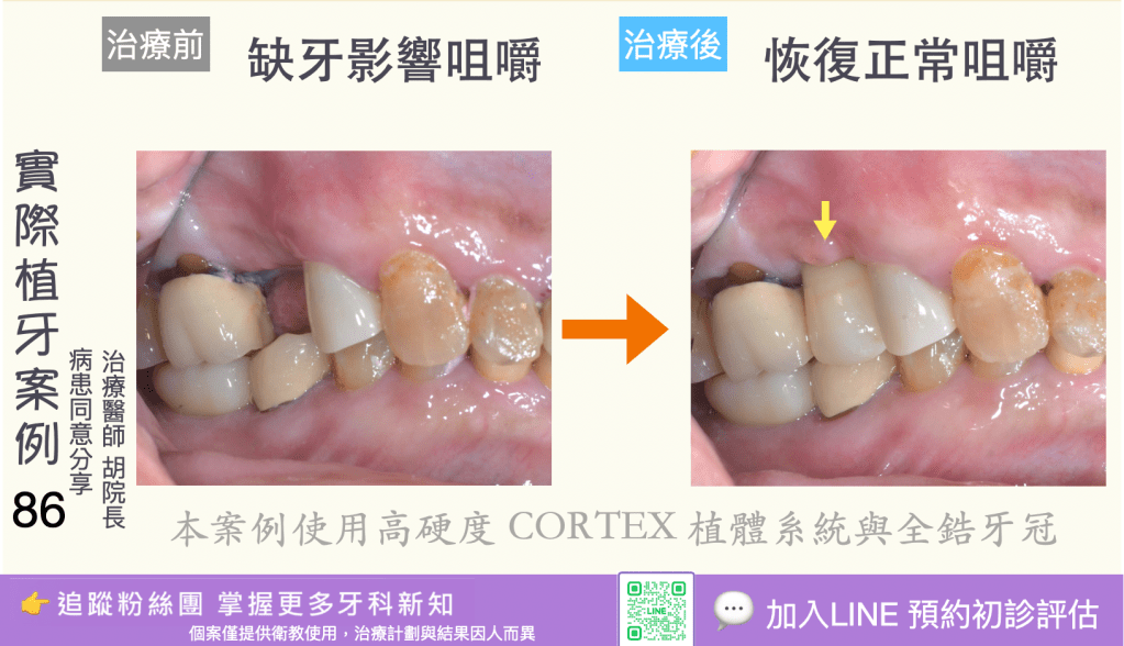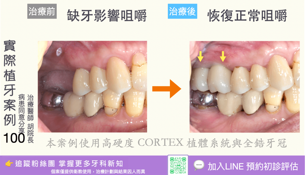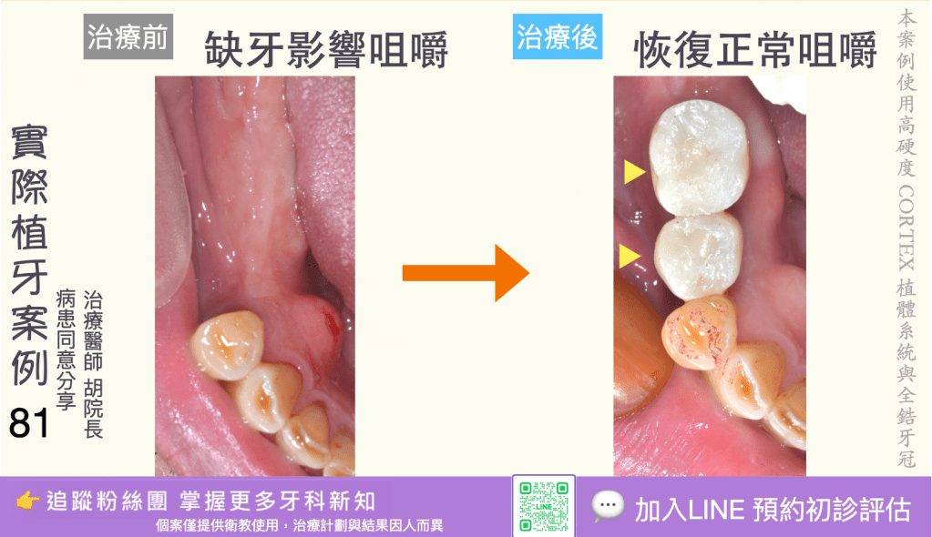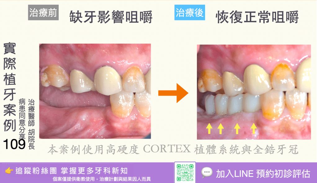 3. 時間較長:完整療程(評估→植體植入→癒合→修復)可能需數月(若需骨增量或分階段治療則更久)。