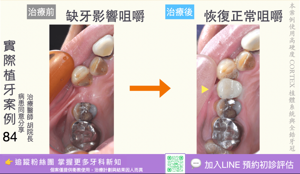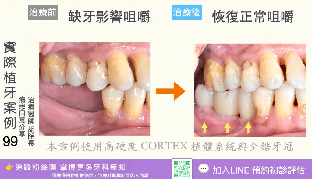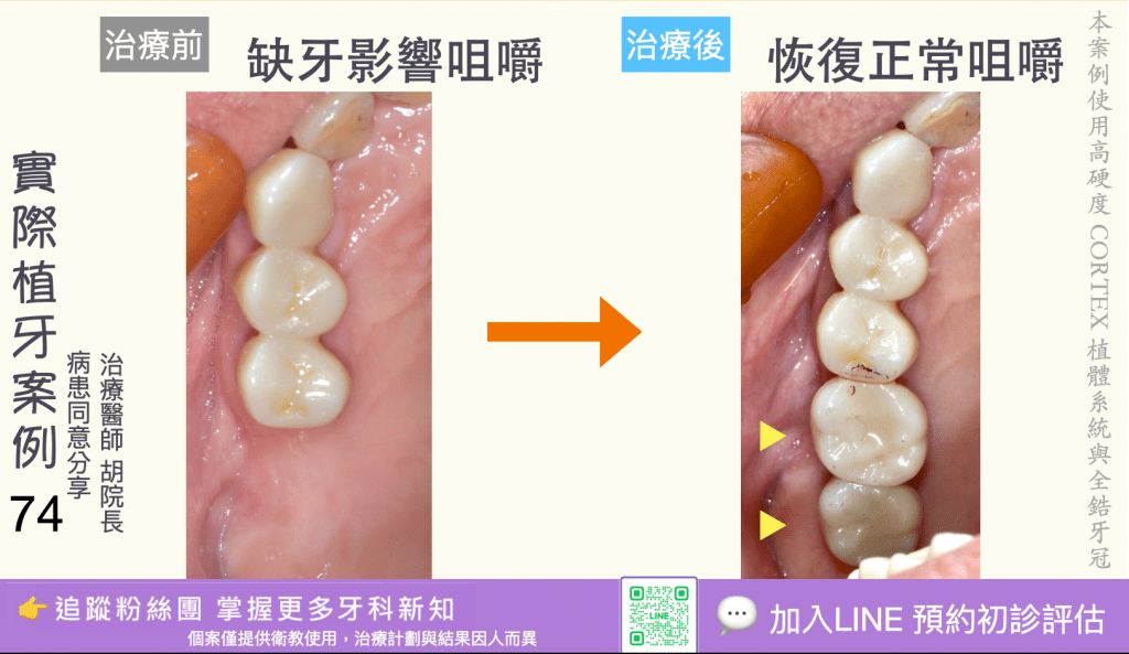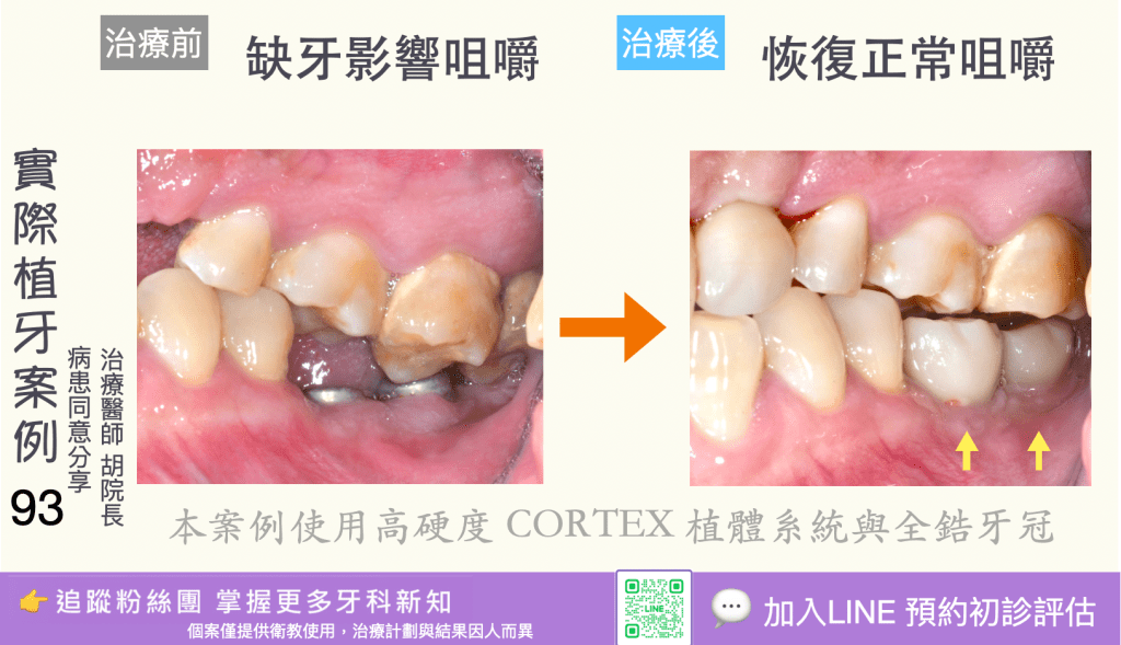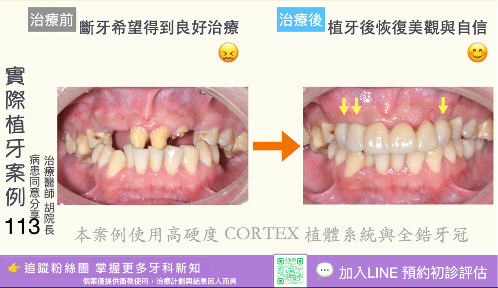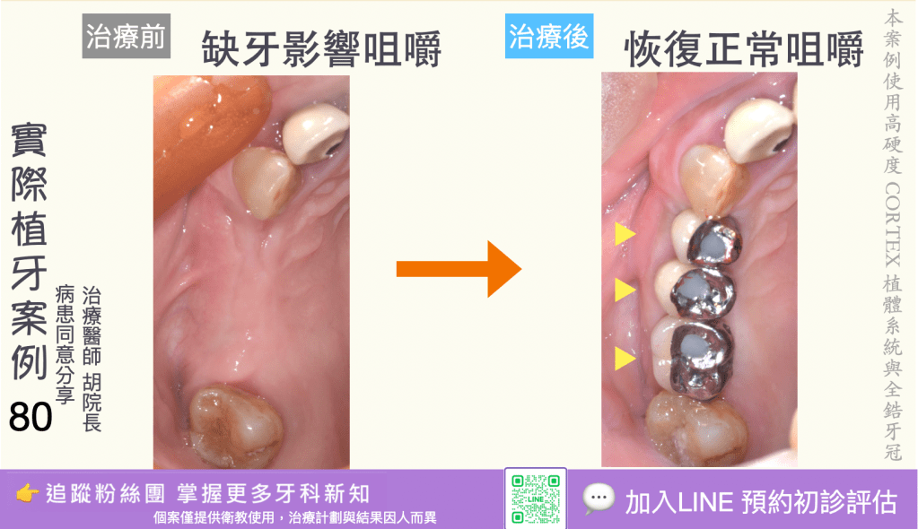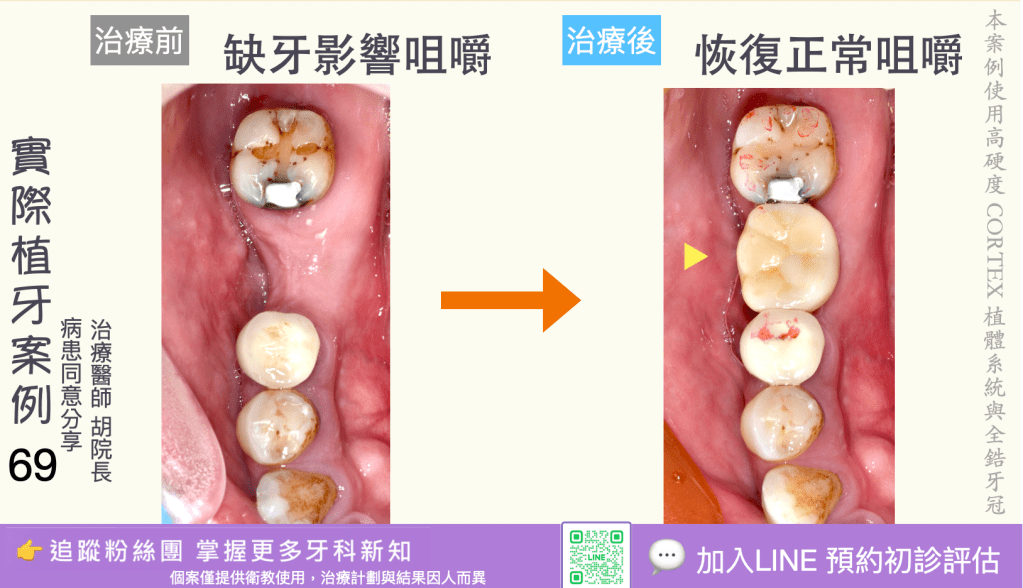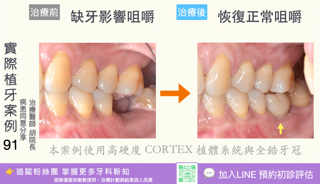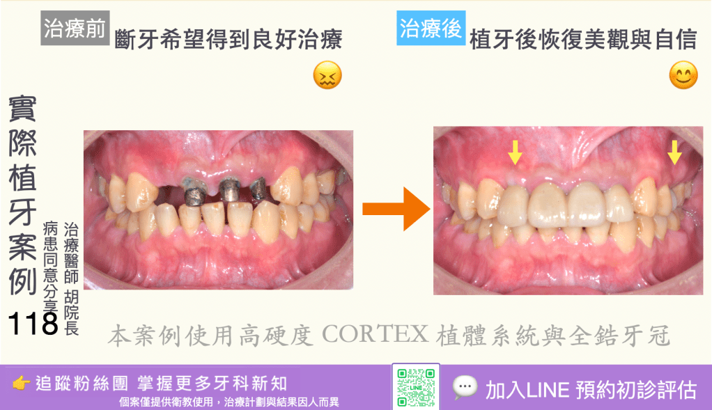 3. 時間較長:完整療程(評估→植體植入→癒合→修復)可能需數月(若需骨增量或分階段治療則更久)。