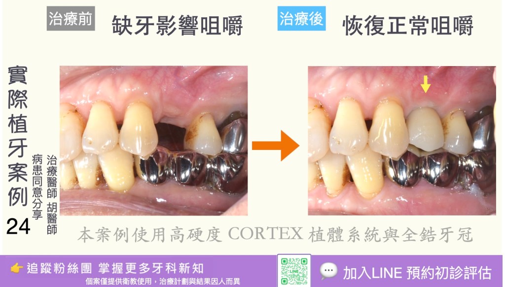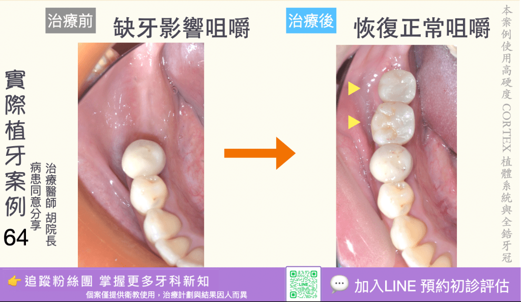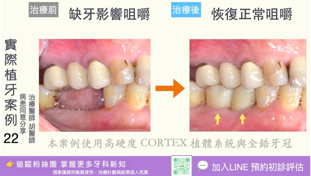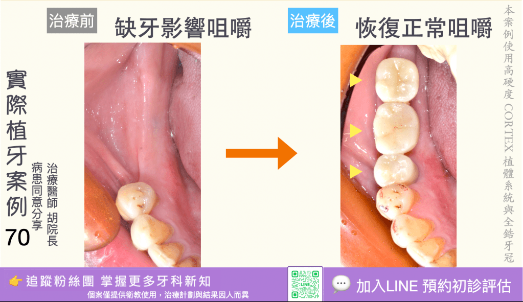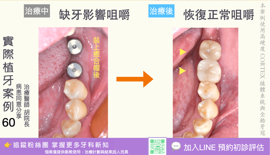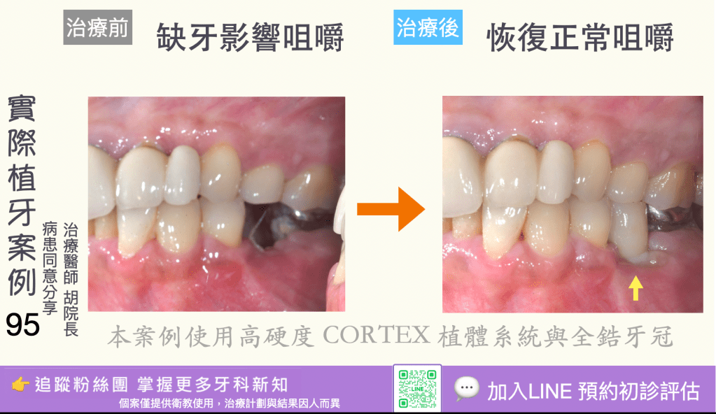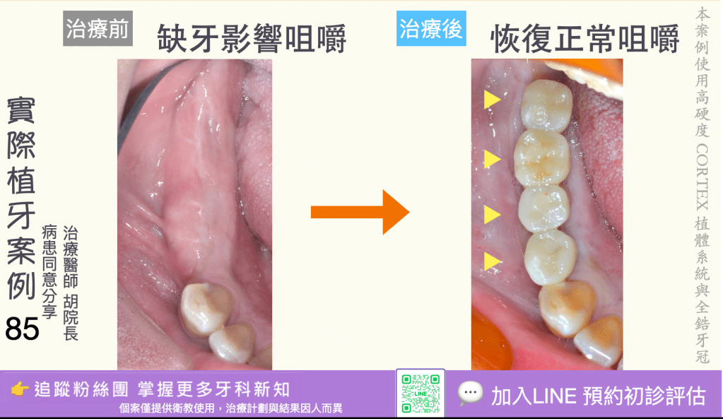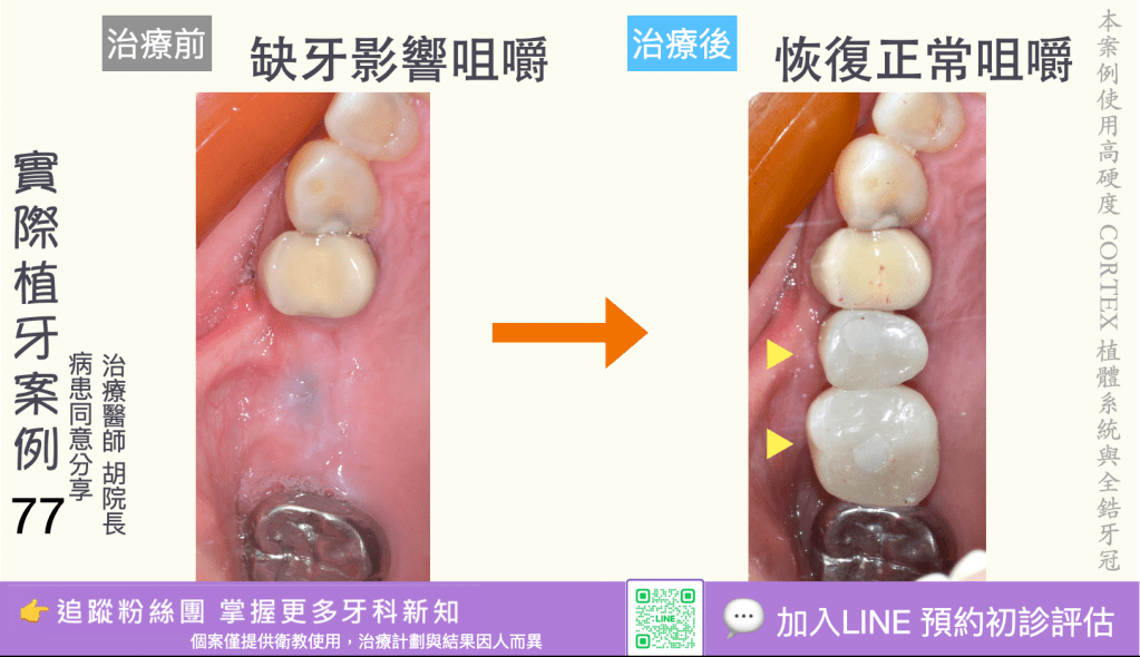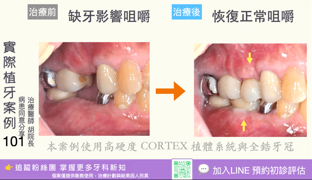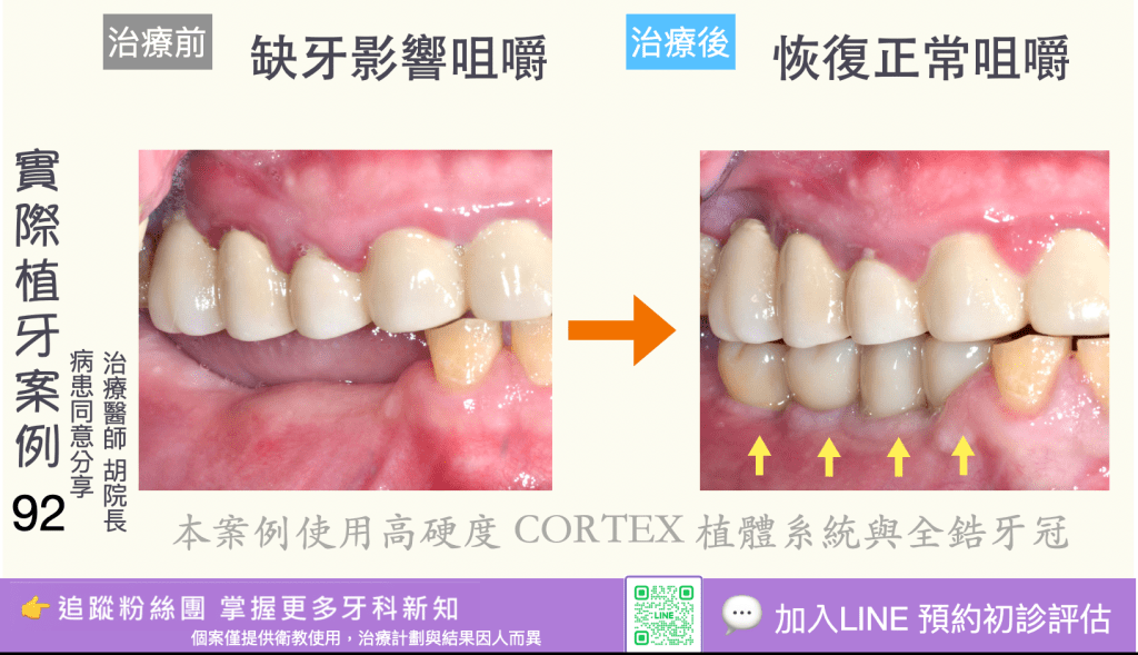 3. 長期穩定、耐用:適當護理下植體可長期存活(成功率高),尤其在良好骨質與口腔衛生下。
