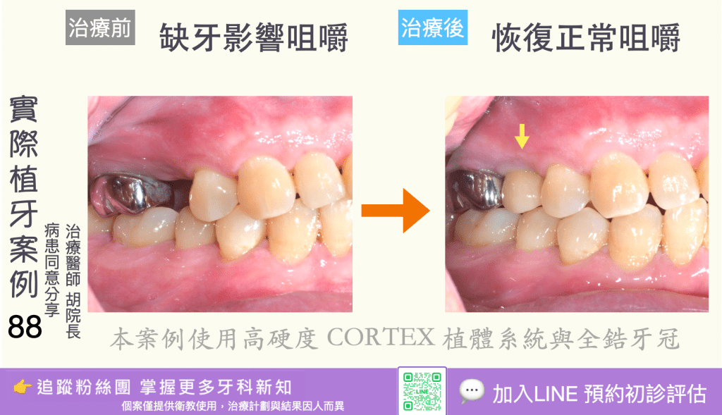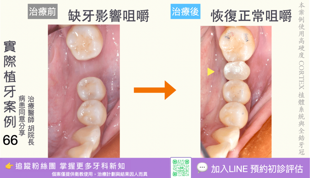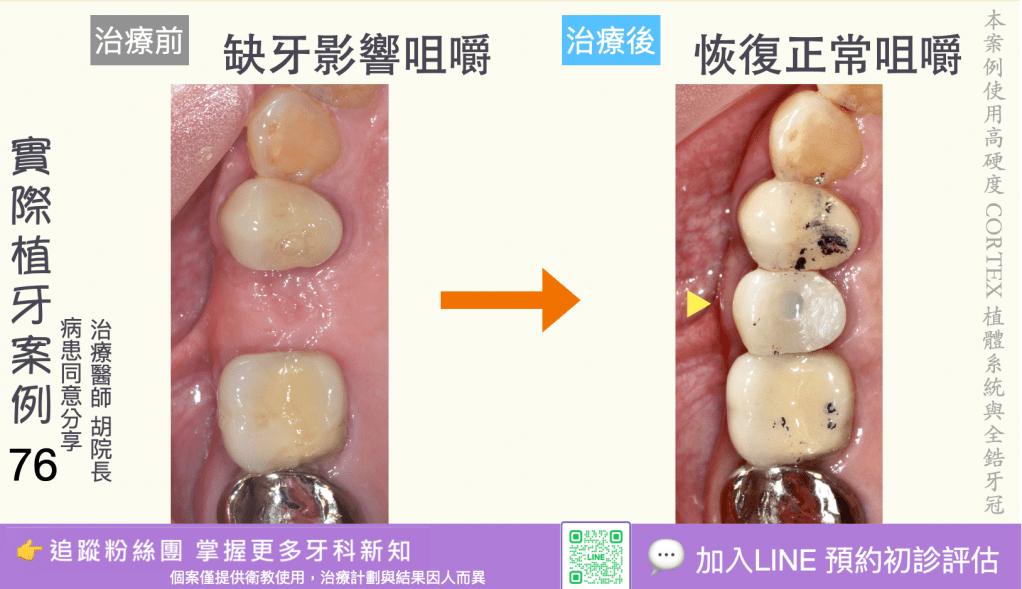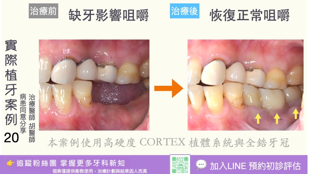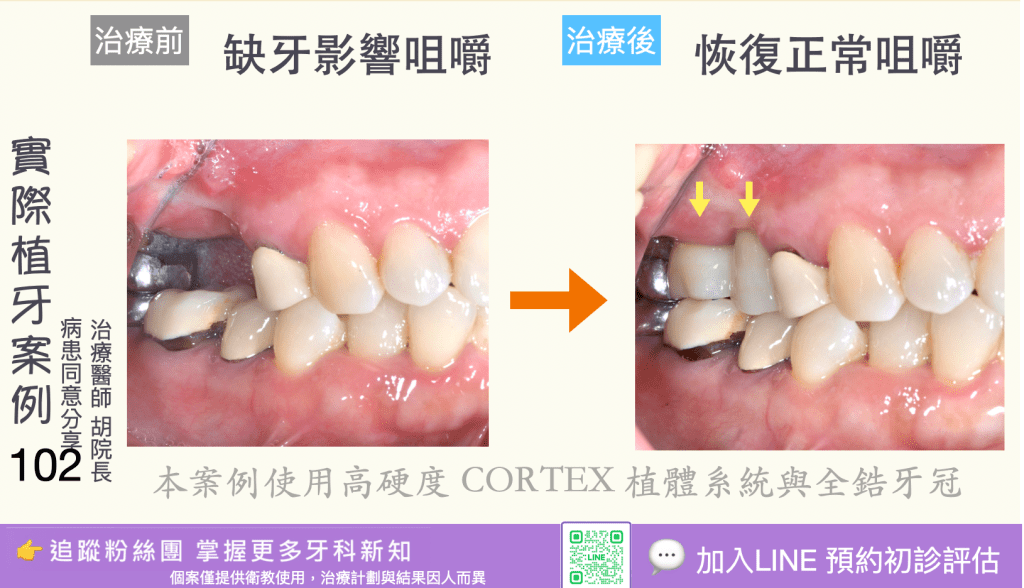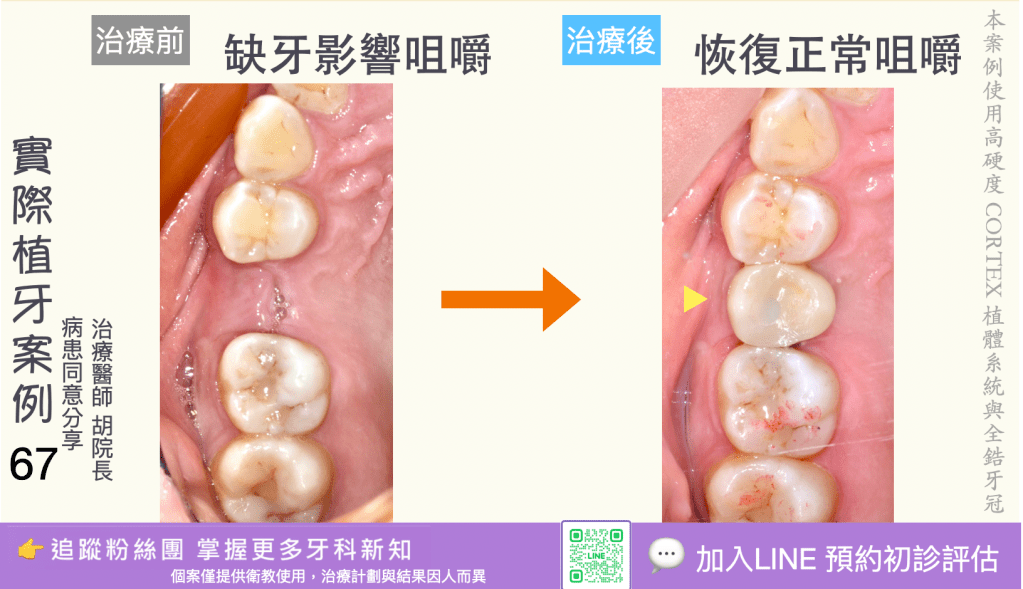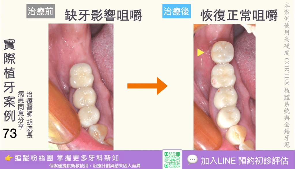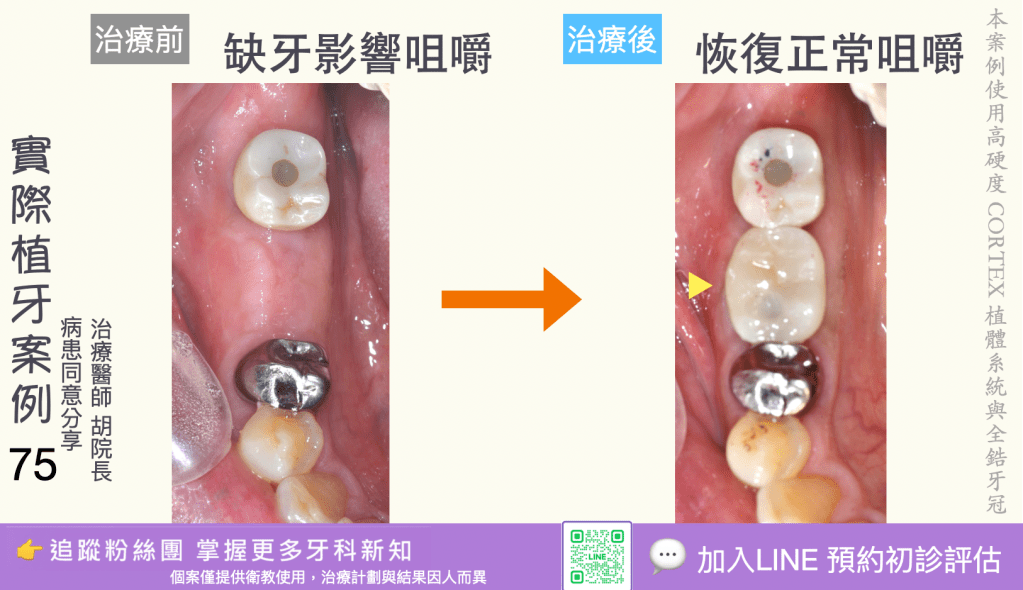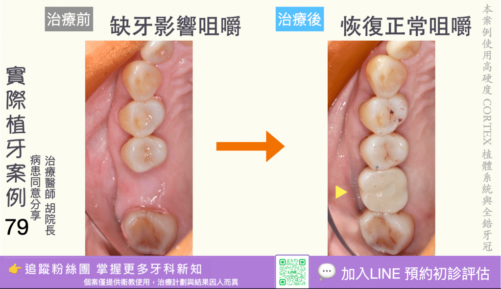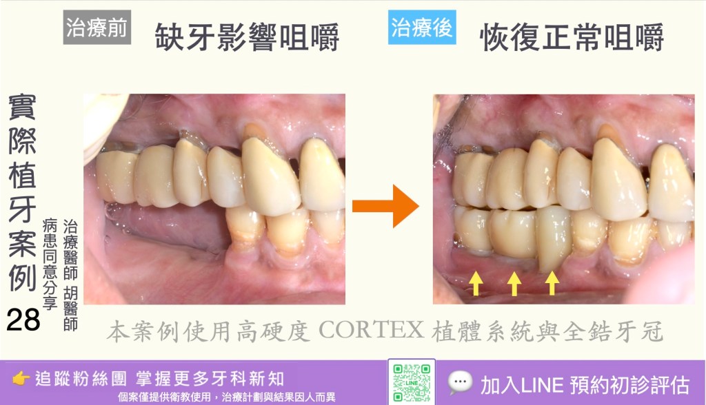 3. 長期穩定、耐用:適當護理下植體可長期存活(成功率高),尤其在良好骨質與口腔衛生下。