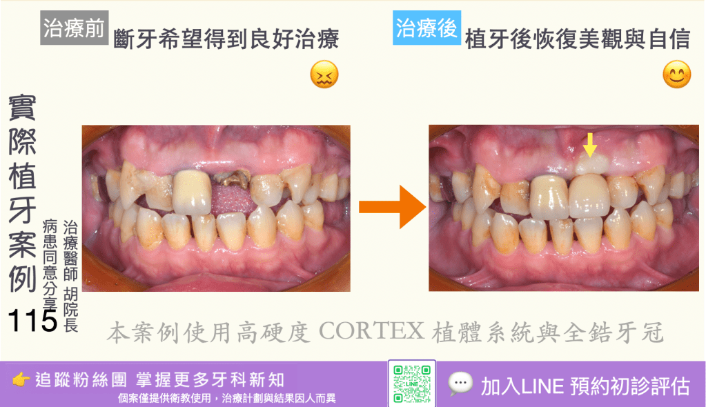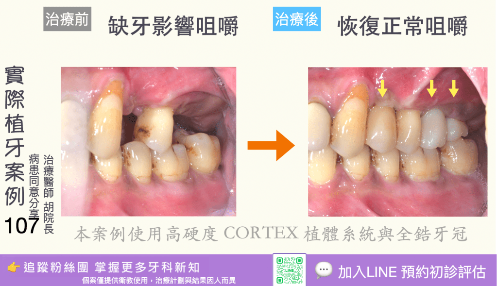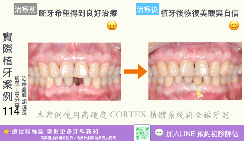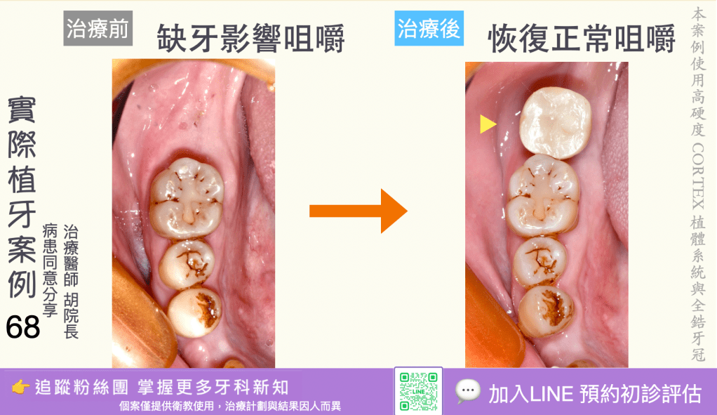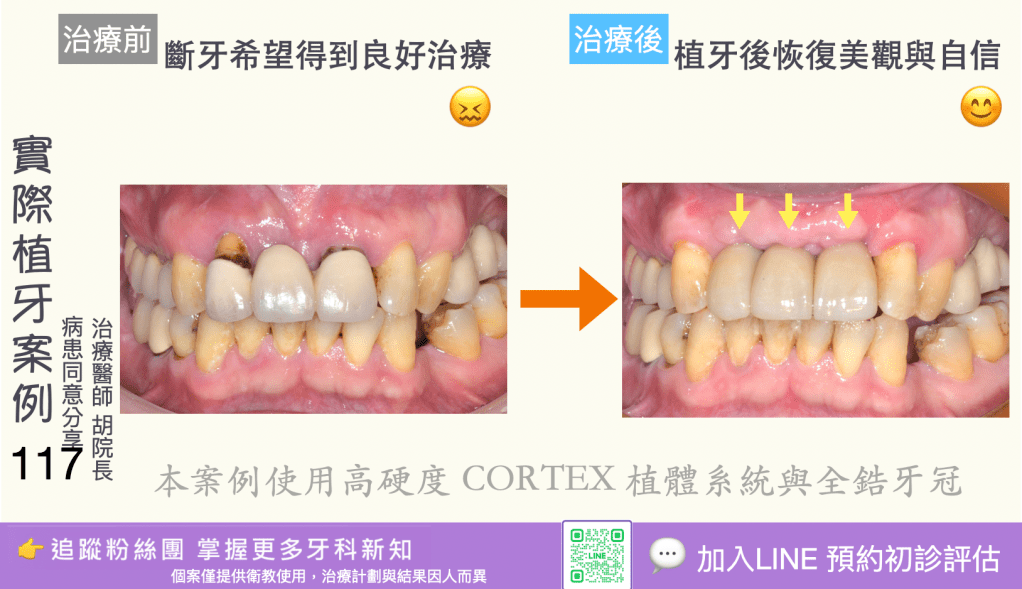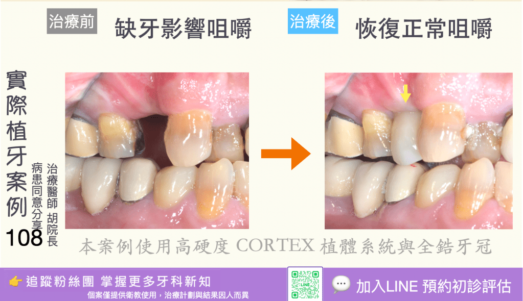 4. 需良好口腔衛生與追蹤:植體雖不會蛀牙,但口腔清潔不良仍會導致「植體周圍炎(peri-implantitis)」,需病人配合長期維護。