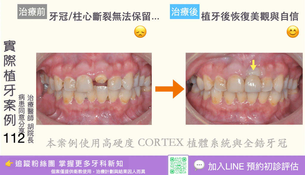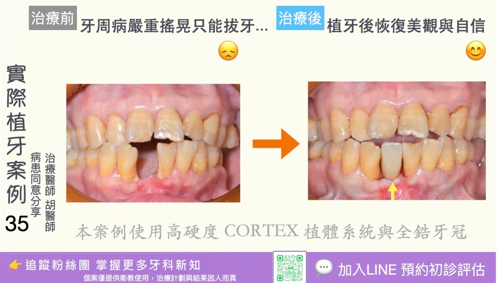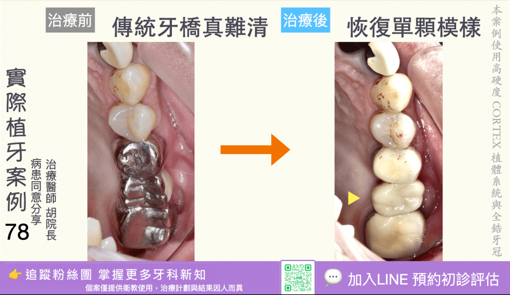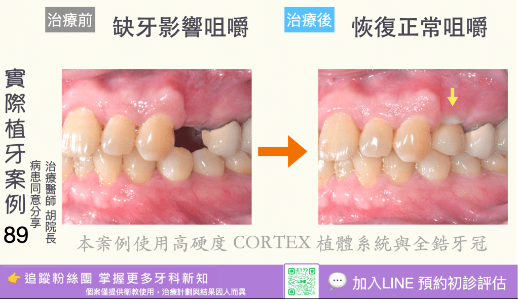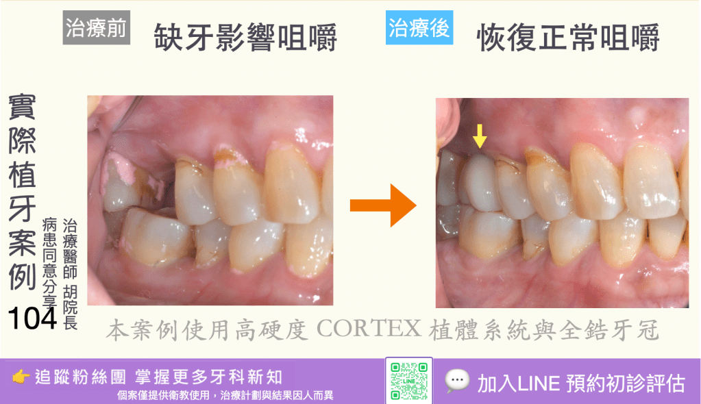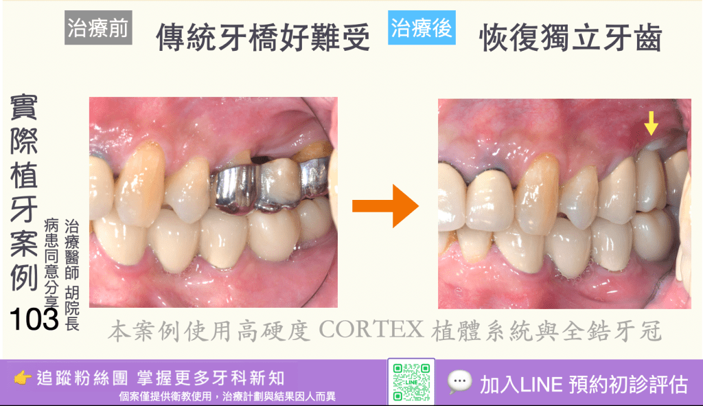 4. 需良好口腔衛生與追蹤:植體雖不會蛀牙,但口腔清潔不良仍會導致「植體周圍炎(peri-implantitis)」,需病人配合長期維護。