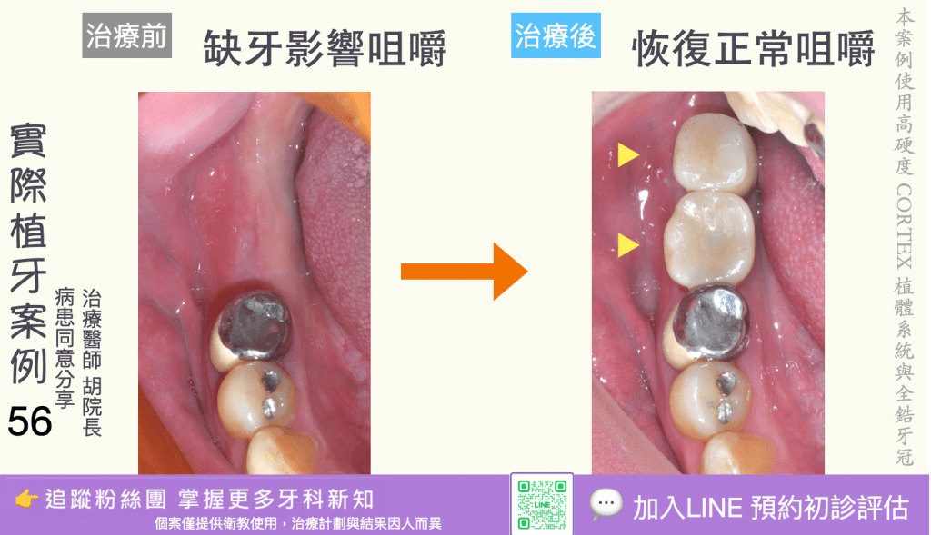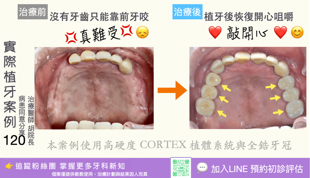 5. 改善假牙不適感:對完全無牙者,植體固位的義齒比傳統活動假牙更穩定、舒適。